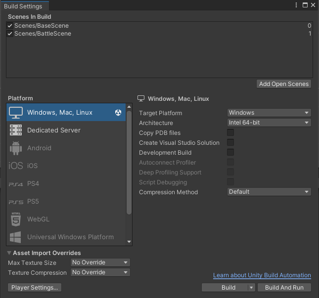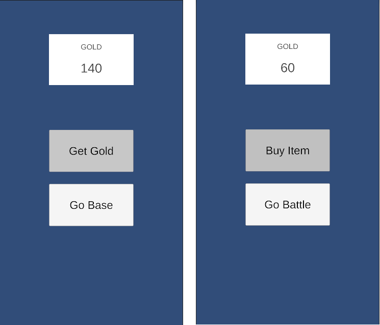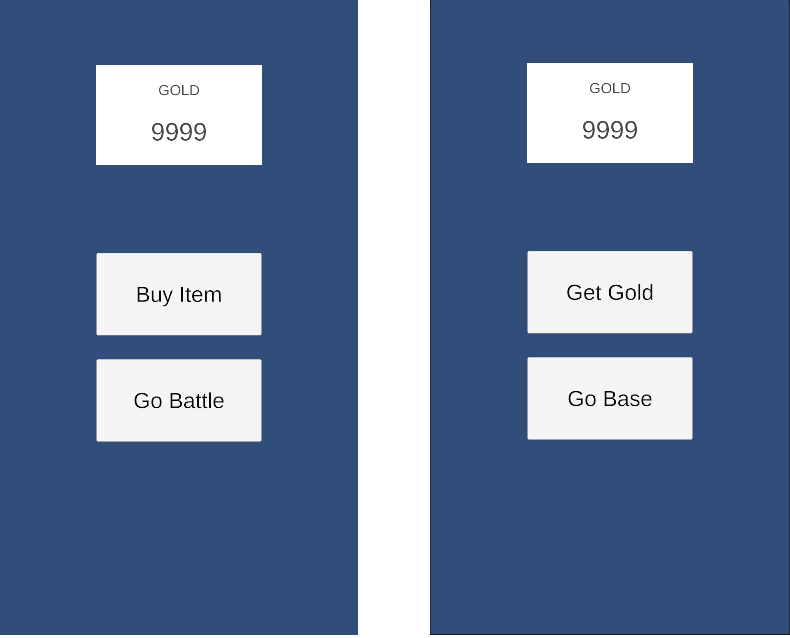 위 사진은 Base Scene과 Battle Scene의 게임 화면이다. 간단하게 Base Scene과 Battle Scene 모두 현재 소유하고 있는 골드를 나타내는 이미지 UI가 있고 Base Scene에는 골드를 사용하는 Buy Item 버튼과 Battle Scene으로 이동하는 Go Battle 버튼이 있다. 그리고 Battle Scene에는 Get Gold 버튼을 통해 골드를 얻을 수 있고 Base Scene으로 이동할 수 있는 Go Base 버튼이 있다. 그리고 현재 골드량을 나타내는 Gold Text는 현재 갖고 있는 골드량에 따라서 바뀐다. 그리고 Build Settings에 들어가서 BattleScene도 빌드할 수 있도록 Scenes In Build에 넣어준다.