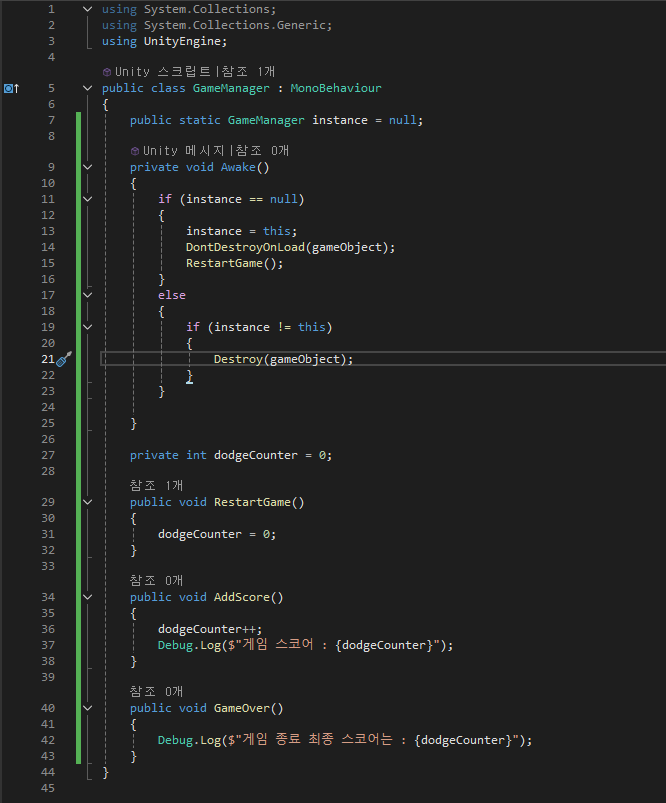 GameManager 스크립트는 싱글턴 패턴으로 구현되어있다. public static으로 GameManager의 instance를 선언해주고 Awake 메시지에서 GameManager 객체의 인스턴스가 없다면 한 번만 만들어준다. if 문에서는 인스턴스가 null이라면 GameManger 객체의 인스턴스를 만들어주고 DontDestroyOnLoad(Object.DontDestroyOnLoad)함수를 통해 씬이 바뀌어도 객체가 사라지지 않도록 해준다. 그리고 객체의 인스턴스가 만들어지면 게임이 다시 시작된것으로 판단해 게임을 재시작하도록 멤버 변수를 초기화하는 RestartGame 함수도 호출한다. 그리고 else문에서는 instance가 GameObject가 아니라면 Destroy 함수로 제거한다. 이 else문의 존재이유는 다른 씬에서도 GameManager라는 오브젝트(객체)가 있을 수 있다. 그런 오브젝트가 있다면 거기서도 인스턴스를 만들려고 시도를 하는데 이미 instance가 있는 상태이기 때문에 else문으로 넘어가고 이미 존재하는 instance는 이전 씬에서 만들어진 것이므로 else문 안에 if문의 조건 instance != this(this는 현재 씬의 객체)을 만족하기 때문에 현재 씬의 오브젝트는 필요없으므로 Destroy(gameObject) 함수를 통해서 오브젝트를 없애준다. 이것이 싱글턴 패턴으로 전체 게임에서 필요한 객체를 여러번 만들지 않고 하나의 객체를 전역으로 사용하는 것을 뜻한다. 지금 GameManager 스크립트에 플레이어가 Saw를 피했을때와 맞았을때의 상황을 함수로 다루고 있으므로 Saw 스크립트에서 위 GameManager의 함수들을 호출해주는 것이 좋다. 이전에 구현했던 것처럼 Saw 스크립트에서 Player와 Ground에 닿았을 때의 이벤트들을 OnTriggerEnter2D 유니티 메시지에서 구현하고 있으므로 여기서 GameManager의 GameOver 함수나 AddScore 함수를 호출해준다. 싱글턴에 대한 구현은 아래에 더 자세하게 다룬다.