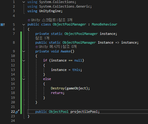 그리고 ObjectPoolManager는 싱글턴으로 작성되어서 현재 Projectile Pool을 관리하고 있다. 그리고 MainTower에서 오브젝트 생성하는 부분을 스택에서 꺼내오는 것으로 바꿔준다.