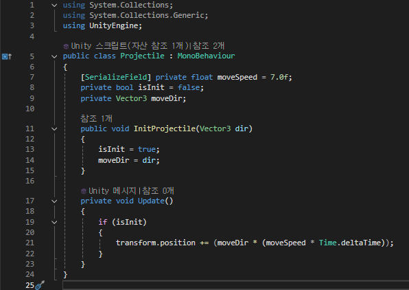 위 스크립트는 발사체의 스크립트이다. 발사체의 방향을 초기화해주는 InitProjectile 함수와 Update에서 발사체가 이동하도록 설정해준다. 여기서 isInit을 이용해서 초기화하는 이유는 오브젝트가 생성되었다고 해서 무조건 실행되어야 하는 것이 아닐 때가 더 많다. 해당 오브젝트가 초기화 되어서 어떠한 정보를 담고 있어야지 그에 맞는 행동들을 실행해야할 때가 있다. 예를 들어 적이 쏜 총알이나 Player가 쏜 총알이나 같은 투사체지만 적의 정보로 초기화한 것과 Player의 정보로 초기화한 총알이 서로 다른 효과를 내야한다. 그래서 초기화의 조건에 따라 다른 행동을 취하도록 한다. 그래서 isInit을 이용해 초기화의 여부를 나타내는 것이다.