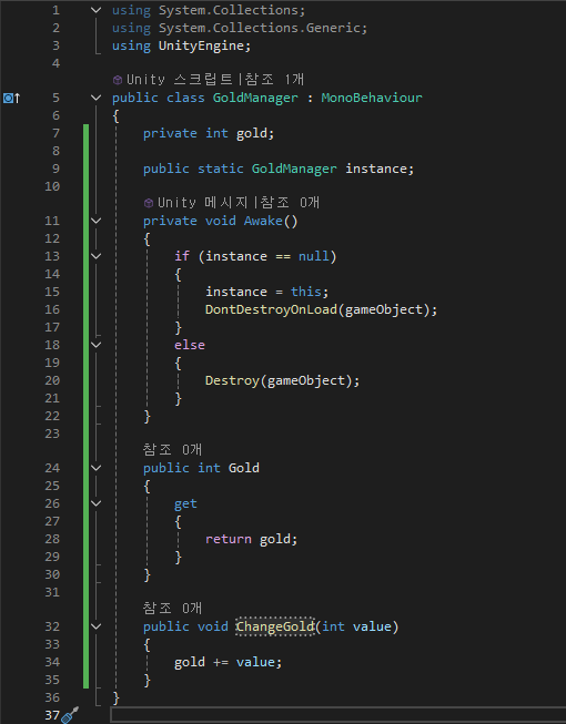 먼저 골드를 관리하는 싱글턴 패턴을 갖는 GoldManager라는 스크립트를 만든다. GoldManager에서는 static으로 GoldManager의 인스턴스를 선언한다.