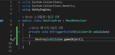 그리고 BoxCollider2D component를 갖는 DestroyArea 오브젝트를 설정해서 투사체가 이 오브젝트를 벗어나면 Destroy 함수를 이용해 사라지도록 한다.