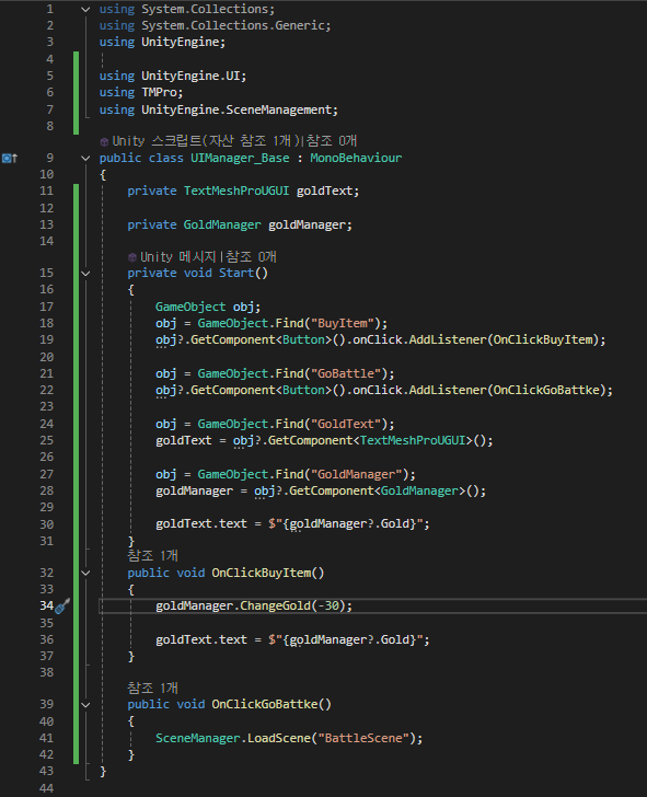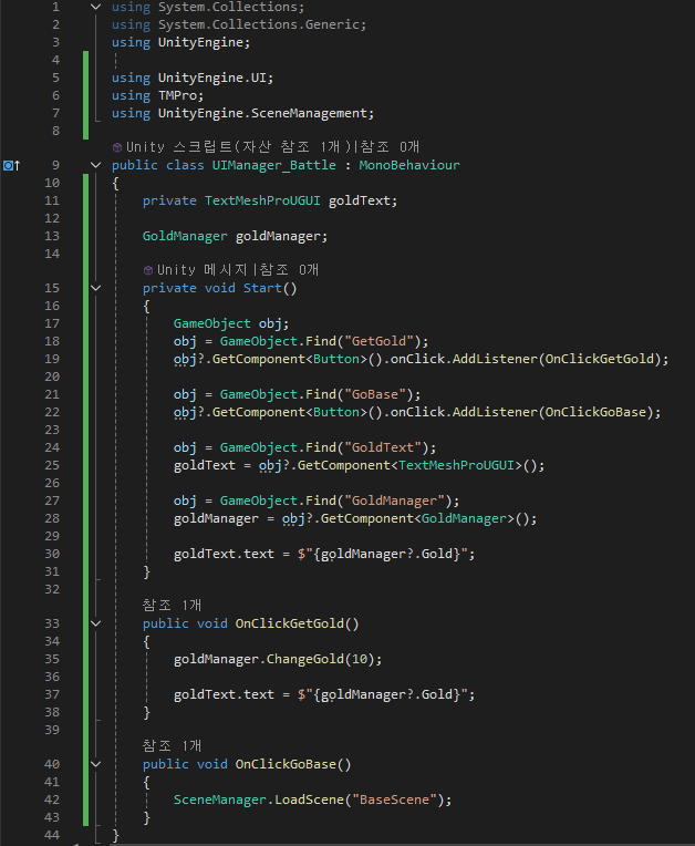 위 스크립트는 Battle Scene에서의 UI를 다루는 스크립트이다. GameObject.Find 함수를 이용해 버튼의 이름을 string으로 대입해서 버튼을 찾고 AddListener 함수를 통해 GetGold 버튼이나 GoBase 버튼이 눌렸을때 각각 실행되어야할 함수를 호출한다. 그리고 싱글턴으로 만들어진 GoldManager 오브젝트에서 Gold 프러퍼티를 이용해서 gold의 양을 가져와 Text로 출력한다. GetGold 버튼이 눌렸을때는 OnClickGetGold 함수를 호출해서 GoldManager의 ChangeGold 함수로 gold를 늘리고 그 변화량을 Text에 적용한다. 그리고 GoBase 버튼을 눌렀을 때는 OnClickGoBase 함수를 호출해서 SceneManager의 LoadScene 함수를 이용해서 BaseScene 이름을 string으로 받아서 scene을 바꾼다.