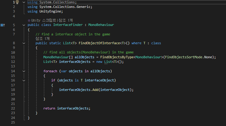 여기서는 FindObjectdByType으로 MonoBehaviour타입의 오브젝트들을 찾는다. MonoBehaviour 은 모든 오브젝트가 갖고있기 때문에 사실상 모든 오브젝트들을 찾아서 배열에 넣는 것이다. 그리고 List를 템플릿으로 선언해서 인터페이스를 담을 수 있는 리스트를 만드는 것이다. 그래서 FindObjectOfInterface는 모든 오브젝트 중에서 원하는 인터페이스를 갖는 오브젝트를 찾아서 리스트에 넣어두는 것이다. 그래서 배경화면 오브젝트에 BackgroundScroll 스크립트를 넣어두면 IBackgrounInterface가 있기 때문에 ScrollManager에서 인터페이스로 가져와서 배경이미지를 스크롤한다.