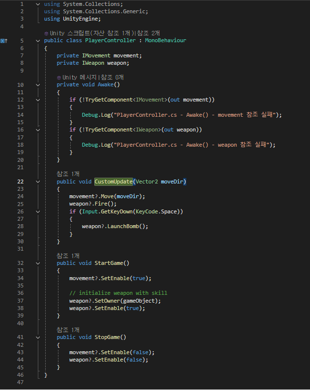 이제 PlayerController에 IWeapon을 추가한다. 그리고 StartGame과 StopGame 함수를 선언해서 각각 게임이 시작되었을때 movement와 weapon의 Enable을 true로 설정하거나 게임이 종료되었을때 Enable을 false로 설정해 게임에서의 Player의 움직임과 무기를 제어한다.