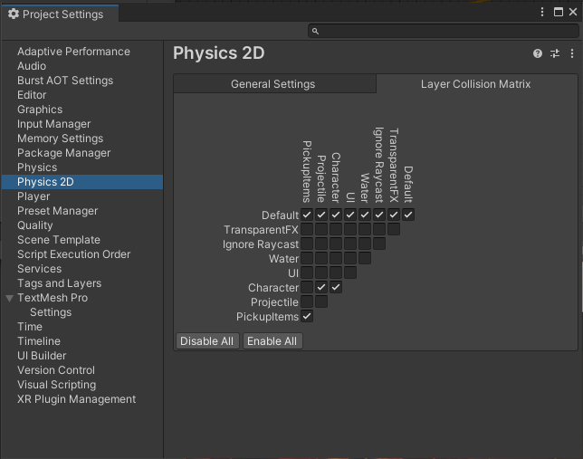 메뉴에서 edit에서 project setting에서 Physics 2D 항목에서 Layer Collision Matrix를 통해서 오브젝트의 Layer를 설정해서 오브젝트 간의 충돌을 결정할 수 있다. Player와 Enemy의 Character Layer, 투사체의 Projectile Layer, 아이템의 PickupItems Layer를 정의해주고 서로 어떤 Layer들이 충돌하는지 설정해준다.