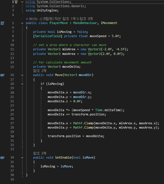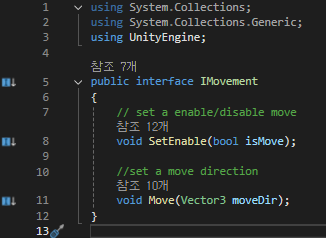 IMovement 인터페이스에서는 오브젝트가 움직이는지 여부를 결정하는 함수 SetEnable과 움직이는 방향을 정하는 함수 Move를 정의한다.
