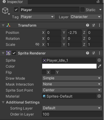 Character Layer는 Projectile Layer, Character Layer와 서로 충돌할 수 있게 해주고 PickupItems Layer는 PickupItems Layer끼리만 충돌하도록 설정한다. 그리고 Player의 Inspector에서 Layer를 Character로 설정한다.