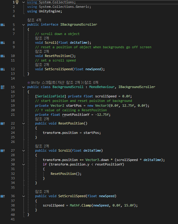 배경화면을 스크롤하기 위한 스크립트 BackgroundScroll.cs 스크립트이다. 그리고 해당 스크립트 내에서 IBackgroundScroller 인터페이스를 선언한다. 이 인터페이스는 배경화면을 아래로 스크롤하는 Scroll, 배경화면을 다시 위로 붙이는 ResetPosition, 스크롤의 스피드를 정하는 SetScrollSpeed를 선언한다. 그리고 BackGroundScroll 클래스에서는 StartPos를 정해놓고 배경화면을 아래로 내리다가 화면 밖으로 벗어나면 다시 StartPos로 배경화면의 위치를 조정하는