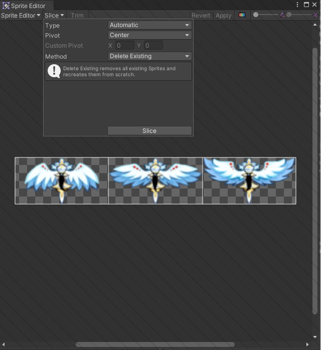 스프라이트의 기본 이미지를 나눌 수 있다. Type을 선택해서 Automatic이나 Column 혹은 Row의 수로 나눌 수 있다. 그리고 나눈 스프라이트를 이용해서 애니메이션을 만든다.