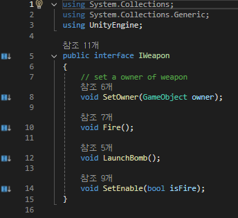 그리고 Player character의 이동(movement)과 투사체 발사를 위한 무기(weapon)을 다루는 PlayerController 스크립트를 만든다. PlayerController에는 캐릭터 움직임을 대한 인터페이스 IMovement와 캐릭터 무기에 대한 인터페이스 IWeapon를 참조한다. 그래서 먼저 IMovement 인터페이스와 IWeapon 인터페이스를 만든다.