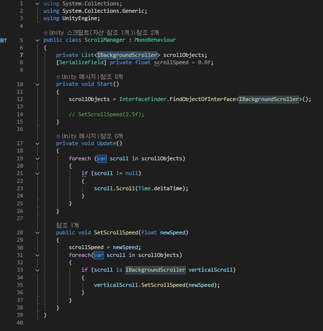 먼저 List로 IBackgroundScroller 형식의 리스트를 선언해주고 IBackgroundScroller를 갖는 배경화면 두 개를 지정해준다. 그런데 유니티에서는 인터페이스를 찾는 함수가 없기 때문에 인터페이스를 찾아서 가져오는 InterfaceFinder를 정의한다.