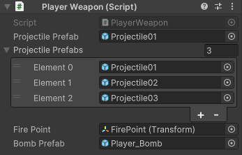 이 인터페이스는 무기의 주인을 설정해주는 SetOwner 함수, 발사하는 Fire 함수, 폭탄을 발사하는 LaunchBomb 함수, 무기의 활성화를 설정해주는 SetEnable 함수를 정의한다. 그리고 PlayerWeapon에서 함수들을 구현해준다. 먼저 투사체가 발사될 곳을 지정해주고 projectile prefabs를 지정해준다. 그리고 bomb prefab도 지정해준다.