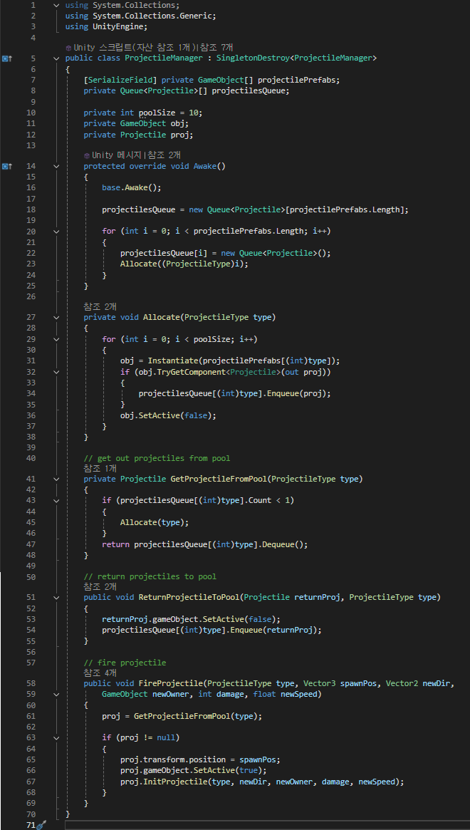 인자로 공격하는 캐릭터 attacker와 공격의 데미지량 damage를 받는 함수 TakeDamage 함수를 정의한다. 이 함수는 피격을 다룬다. 그리고 발사체에 대한 스크립트 Projectile 스크립트를 만든다. Projectile 스크립트에서 OnTriggerEnter2D 유니티 메시지를 이용해서 충돌을 다룬다. 먼저 발사하는 오브젝트나 그 오브젝트와 같은 Tag에 있는 오브젝트와 부딪히면 return으로 함수를 탈출한다. 그리고 DestroyArea에 닿으면 Projectile이 사라지게 한다. 그리고 collision으로 Projectile과 충돌한 오브젝트에 대한 정보를 받아오는데 그 오브젝트에 IDamaged가 있다면 TakeDamaged 함수에 Projectile의 소유자(Owner)와 데미지량을 인자로 호출한다. Projectile의 Tag와 Layer를 Projectile을 변경한다. ProjectileManager로 씬이 바뀌면 싱글턴으로 만들어준다. ProjectileManager은 오브젝트 풀의 역할을 한다. 먼저 Projectile prefab을 지정해주고 그 Projectile들을 큐로 Projectile을 미리 만들어서 저장하는 풀을 만든다. 이전 오브젝트 풀링에서 했던 것처럼 Allocate으로 Instantiate으로 특정 개수만큼 미리 만들고 큐에 저장한다. 그리고 GetProjectileFromPool 함수로 큐에서 Projectile을 빼서 사용하고 ReturnProjectileToPool 함수로 사라진 Projectile을 비활성화하고 큐에 넣는다. 그리고 투사체를 발사하는 FireProjectile 함수를 선언한다.