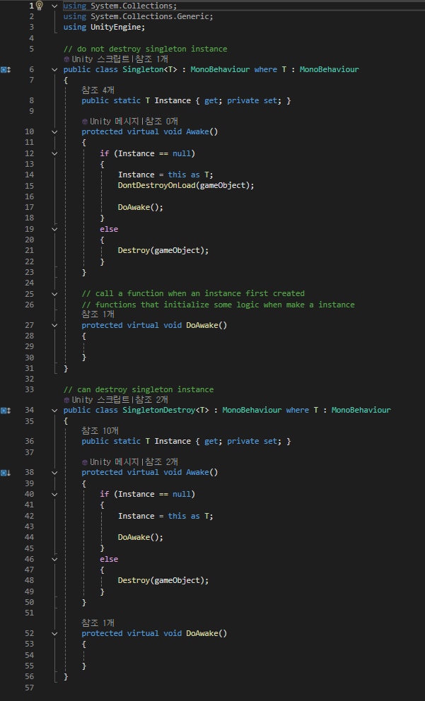 그리고 IMovement 인터페이스를 상속받는 PlayerMove 스크립트를 구현해서 Player 캐릭터의 이동을 구현한다. 그리고 PlayerMove 스크립트를 Player 오브젝트에 넣어준다. 이동 속도와 이동 가능한 범위를 설정하고 Move 함수를 구현한다. 그리고 PlayerController 스크립트에서 IMovement를 찾아서 movement에 저장하고 CustomUpdate 함수에서 Move 함수를 호출한다. 여기서 CustomUpdate 함수는 PlayerController를 제어하는 스크립트의 Update에서 호출해서 제어한다. 그 PlayerController 함수를 제어하는 스크립트가 GameManager 스크립트이다. GameManager 스크립트는 게임의 전반적인 흐름을 관리한다. 게임의 시작, 정지, 종료와 사운드 관리, 씬 관리, 에셋 로딩 입력시스템 등등을 제어한다. 이 스크립트는 싱글턴으로 구현한다. 싱글턴을 구현하기 위해서 Singleton 스크립트를 구현한다. Singleton 스크립트를 통해 싱글턴 패턴을 사용하는 클래스에서 Singleton 스크립트를 상속받아서 사용한다. Singleton은 씬이 변경되어도 인스턴스를 유지하는 싱글턴과 씬이 변경되면 인스턴스를 삭제하는 두 가지로 구현한다.