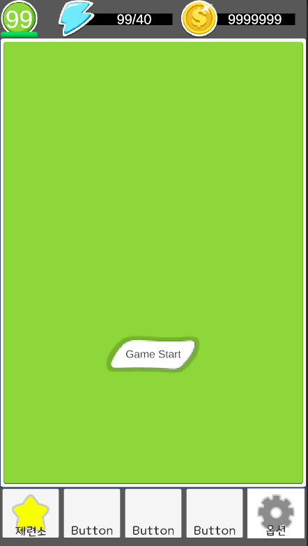 위 사진은 로비 씬의 화면이다. 아래 버튼들을 누르면 아래에서 팝업 창이 올라오도록 할 것이다.