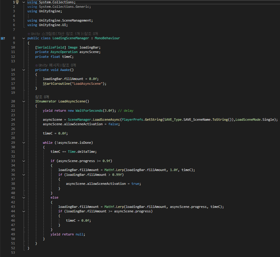 위 사진은 로딩씬의 화면이다. 로딩이 진행되면 로딩 중이라는 글자 아래에 Image 바가 채워질 것이다. 로딩 씬을 제어하기 위해 LoadingSceneManager 스크립트를 작성한다.