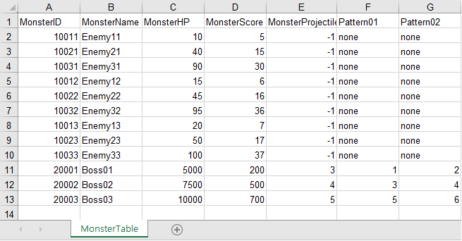 그리고 EnemySpawnManager에서 10번 일반 몬스터를 소환했다면 보스 몬스터를 소환한다. 보스 몬스터를 생성할 때 보스의 weapon을 Boss_Weapon에서 구현한 것으로 지정하고 포스를 초기화한다. 그리고 보스가 죽었을 때 OnBossDied 이벤트를 이용해서 다음 레벨로 가는 NextLevel 함수를 호출한다. 그리고 이번에는 테이블을 이용한 몬스터의 데이터 세팅을 한다. 먼저 엑셀로 Data Table을 작성한다.