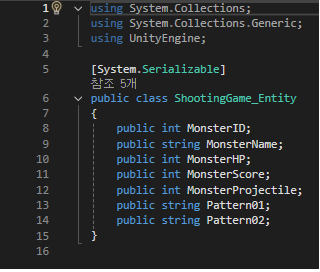그리고 아까 생성한 엑셀 파일과 같은 이름의 스크립트에서 List의 타입을 ShootingGame_Entity로 바꿔준다.