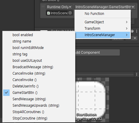 그리고 AddListener를 안쓰고 버튼의 이벤트를 다루려면 버튼의 Inspector 창의 OnClick에서 오브젝트를 지정하고 그 오브젝트 내에서 실행할 함수를 설정한다.