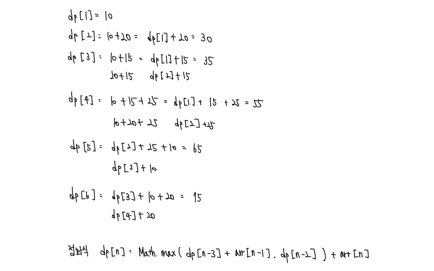 dp[n] = Math.max(dp[n-3] + arr[n-1], dp[n-2]) + arr[n]