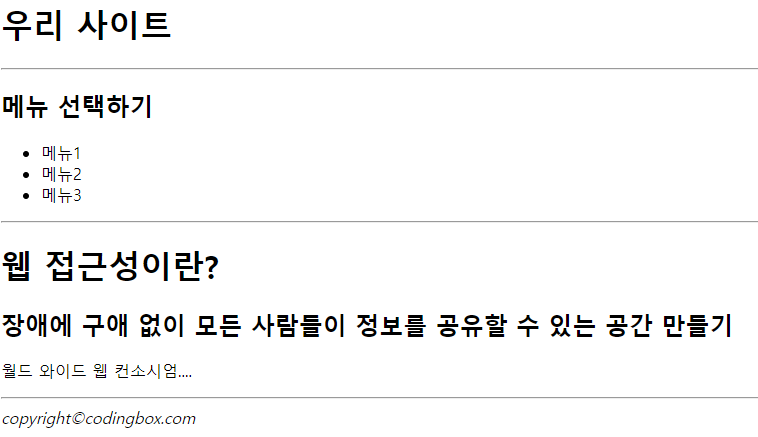 <!-- - ์์ญ์ ๊ตฌ๋ถํ๊ธฐ์ํ <div>ํ๊ทธ - ์๋จ, ๋ฉ๋ด, ๋ณธ๋ฌธ, ํ๋จ, ๋ฑ๊ณผ ๊ฐ์ด ์น ํ์ด์ง์ ๋ ์ด์์์ ๋ํ ์์ญ์ ๊ตฌ๋ถํ๊ธฐ ์ํด ์ฌ์ฉ๋๋ค. - ์๋ก ์ค์ฒฉ๋์ด ์ฌ์ฉํ ์ ์์ผ๋ฉฐ, ๋ค๋ฅธ ํ๊ทธ๋ฅผ ํฌํจํ ์ ์๋ค. - id ์์ฑ -> ์์ญ์ ๋๋๋ div์ ์ฌ์ฉ๋ ๊ฒฝ์ฐ, ํด๋น ํ๊ทธ๊ฐ ์ด๋ค ์์ญ์ผ๋ก ์ฌ์ฉ๋์๋์ง๋ฅผ ํ์ ํ๊ธฐ ์ํด ์ง์ ํ๋ค. -> ๋ค๋ฅธ ์์์ ์ค๋ณต๋ ๊ฐ์ ๊ฐ์ง ๋ชปํ๋ค. --> <!-- ์ฌ์ดํธ ์ ์ฒด ์์ญ --> <div id="contianer"> <!-- ์ฌ์ดํธ ์๋จ ์์ญ(๋ก๊ณ , ๋ฉ์ธ๋ฉ๋ด ๋ฑ)--> <div id="header"> <h1>์ฐ๋ฆฌ ์ฌ์ดํธ</h1> </div> <hr/> <!-- ์ฌ์ดํธ์ ๋ด์ฉ ์์ญ(์ฌ์ด๋๋ฐ, ๋ด์ฉ ๋ฑ)--> <div id="content"> <!-- ์ผ์ชฝ ์ฌ์ด๋๋ฐ ์์ญ--> <div id="sidebar"> <h2>๋ฉ๋ด ์ ํํ๊ธฐ</h2> <ul> <li>๋ฉ๋ด1</li> <li>๋ฉ๋ด2</li> <li>๋ฉ๋ด3</li> </ul> </div> <hr/> <!-- ์ค๋ฅธ์ชฝ ๋ณธ๋ฌธ ์์ญ--> <div id="main"> <!-- ์ ๋ชฉ --> <h1>์น ์ ๊ทผ์ฑ์ด๋?</h1> <!-- ์์ ๋ชฉ --> <h2> ์ฅ์ ์ ๊ตฌ์ ์์ด ๋ชจ๋ ์ฌ๋๋ค์ด ์ ๋ณด๋ฅผ ๊ณต์ ํ ์ ์๋ ๊ณต๊ฐ ๋ง๋ค๊ธฐ </h2> <p> ์๋ ์์ด๋ ์น ์ปจ์์์.... </p> </div> </div> <hr/> <!-- ์ฌ์ดํธ ํ๋จ ์์ญ(์นดํผ๋ผ์ดํธ, ์ฃผ์ ๋ฑ)--> <div id="footer"> <address> copyright©codingbox.com <!-- & : ยฉ ํํ--> </address> </div>๊ฒฐ๊ณผ๊ฐ