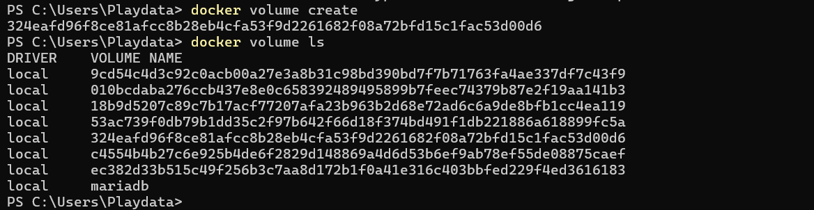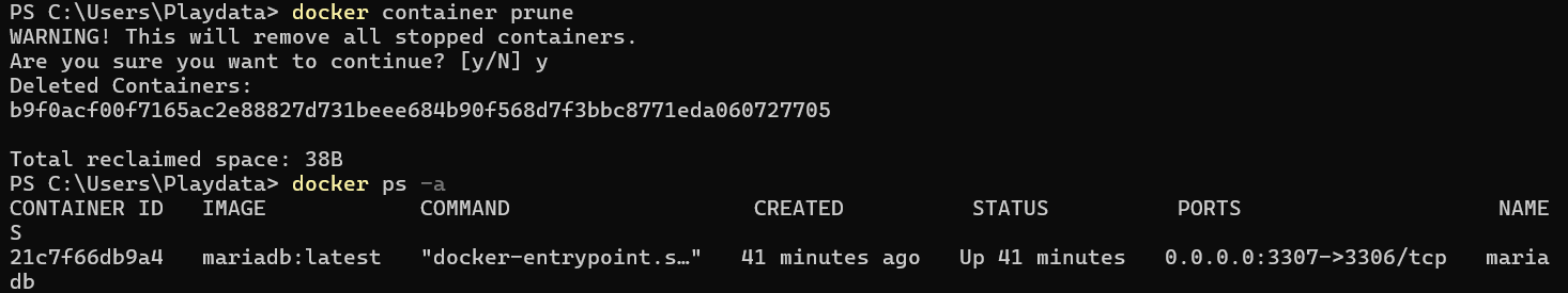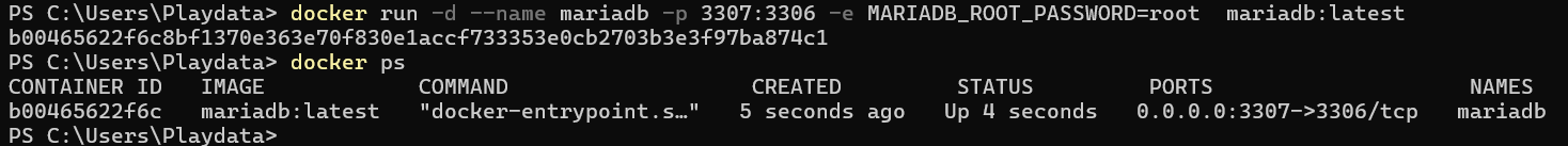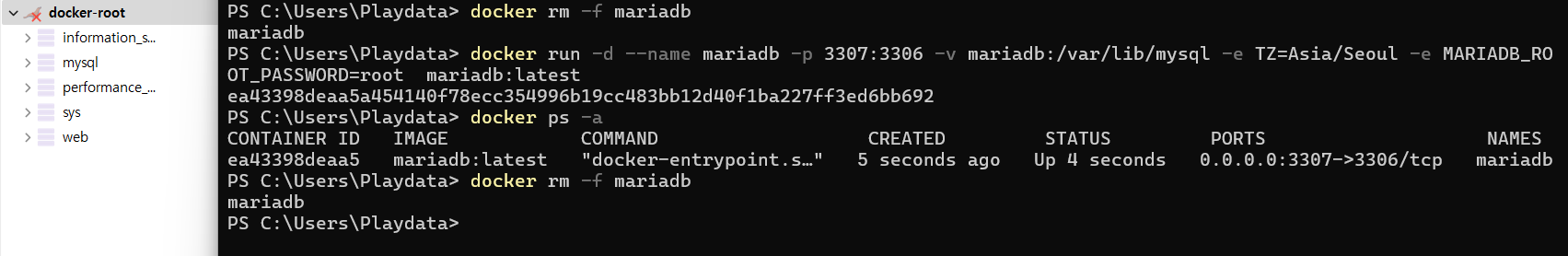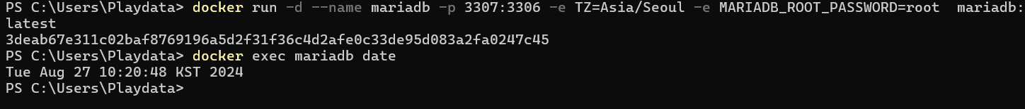 ex) docker run -d --name mariadb -p 3307:3306 -v mariadb:/var/lib/mysql -e TZ=Asia/Seoul -e MARIADB_ROOT_PASSWORD=root mariadb:latest
