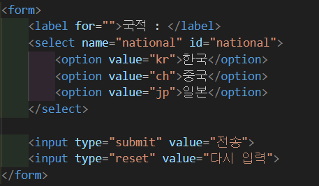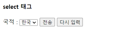 → 여기서 국적 선택하면 option에 지정해둔 값이 전달됨