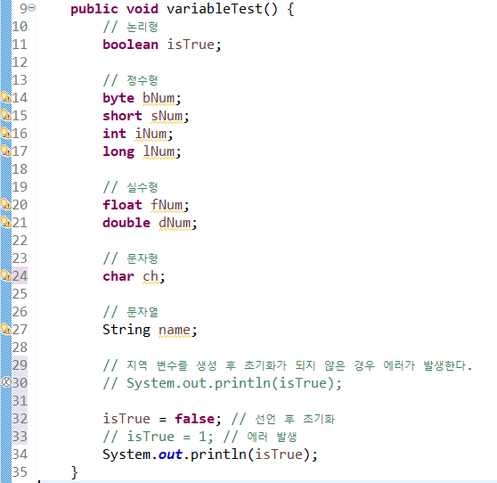 → 변수를 선언하고 사용하지 않거나 초기화하지 않은 경우에 왼쪽에 노란 경고 표시가 뜬다