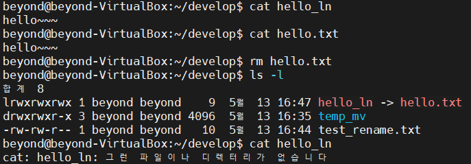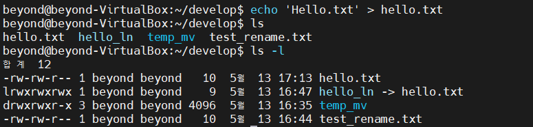 - ln -s hello.txt hello_ln 으로 링크 파일 생성