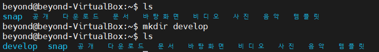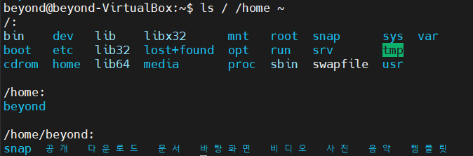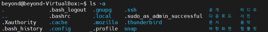 - ls는 숨김 파일이나 폴더는 보여주지 않지만 ls -a 한 경우에는 숨김 파일까지 보여줌(앞에 . 붙은 게 숨겨진 파일)