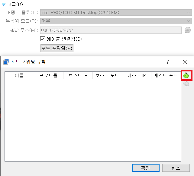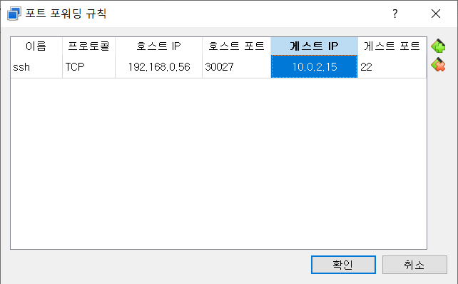 → 이때 호스트 IP는 PC IP, 게스트 IP는 가상머신 IP, 호스트 포트는 아무거나, 게스트 포트는 22로 함