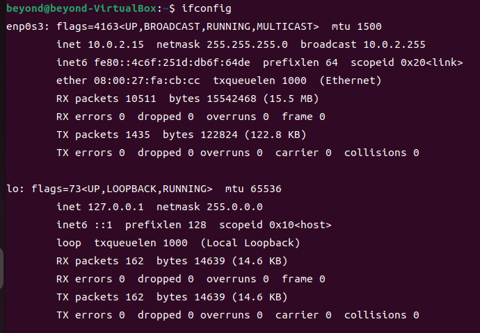 → 가상머신의 IP가 10.0.2.15임을 확인할 수 있음