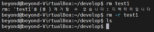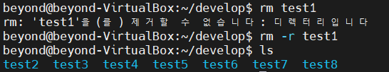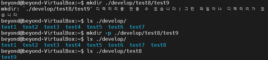 - mkdir ./develop/test8/test9를 실행한 경우, test8이 존재하지 않으면 오류가 발생함 → 없어도 생성할 수 있도록 하는 게 -p 옵션 !!(test8도 자동으로 생성해줌)