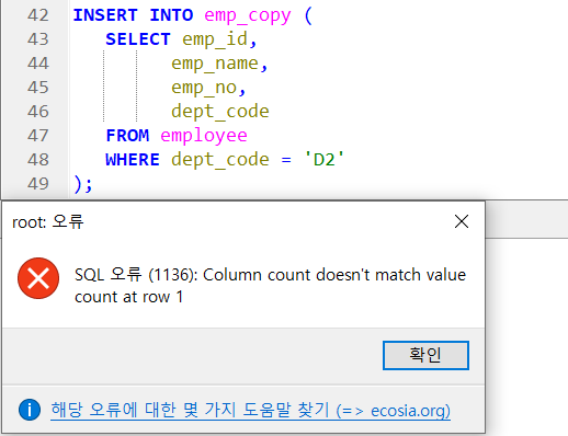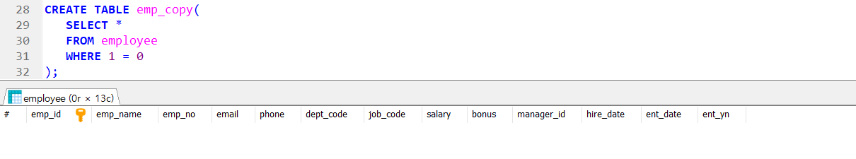 → WHERE 1 = 0 은 false 이기 때문에 빈 테이블 생성하는 것 !