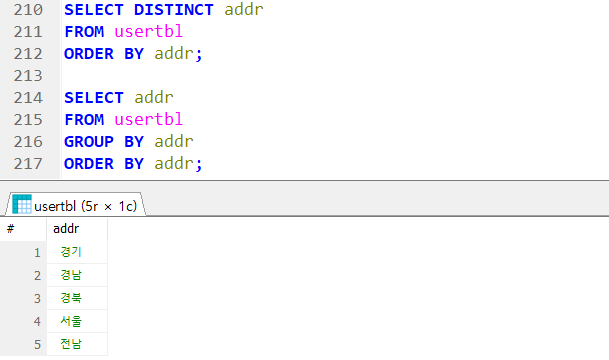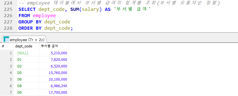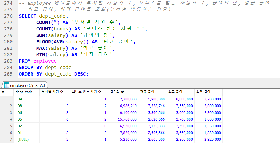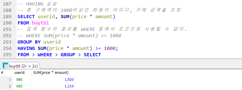 → FROM > WHERE > GROUP > SELECT 순으로 실행됨