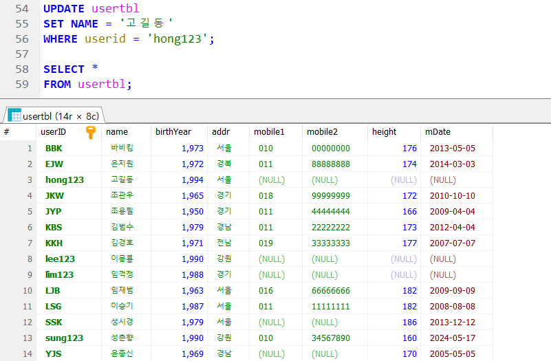 행 단위로 데이터 삭제(테이블에서 우클릭으로도 삭제 가능 !)