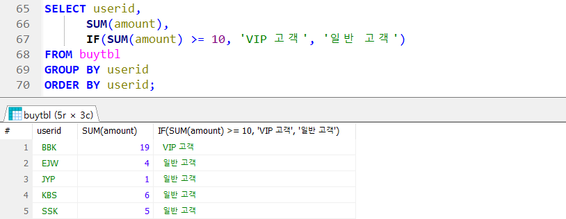 ex) 고객별 전체 구매 개수의 합계(10개 이상이면 VIP, 아니면 일반 고객)