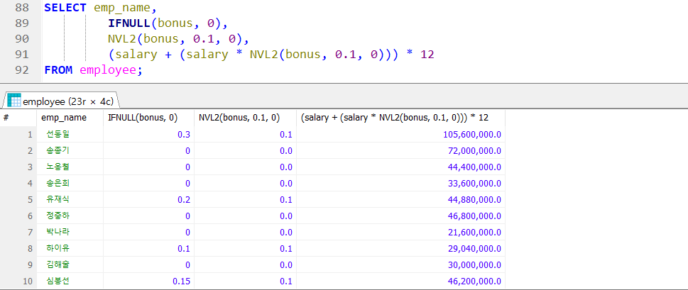 ex) employee 테이블에서 보너스를 0.1 동결하여 직원명, 보너스율, 동결된 보너스율, 보너스가 포함된 연봉 조회
