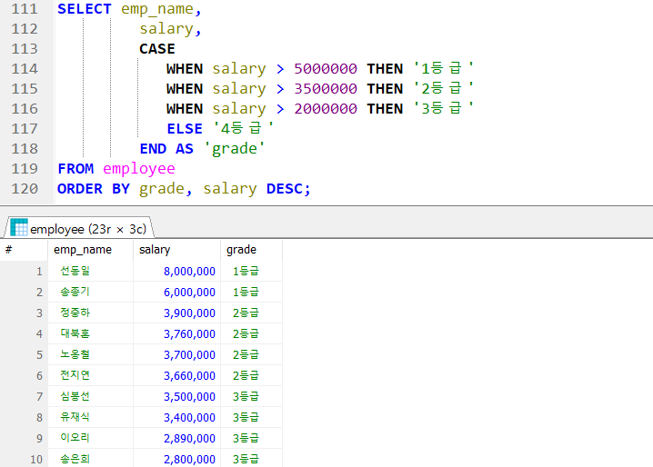 ex) employee 테이블에서 직원명, 급여, 급여 등급(1 ~ 4) 조회