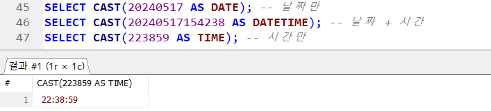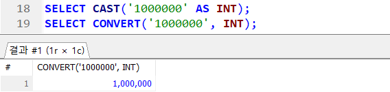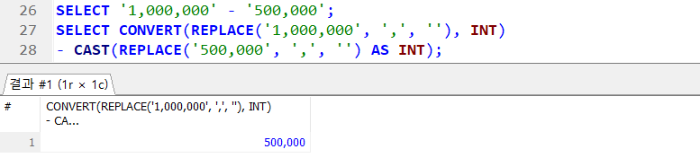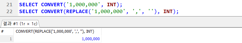 → SELECT CAST(REPLACE('1,000,000', ',', '') AS INT); 도 같은 결과 !