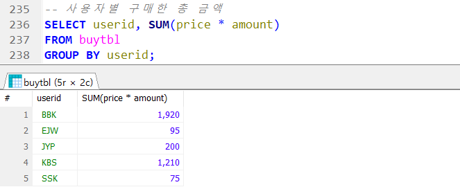 ex) 총 구매액이 1000 이상인 회워의 아이디, 구매 금액 조회
