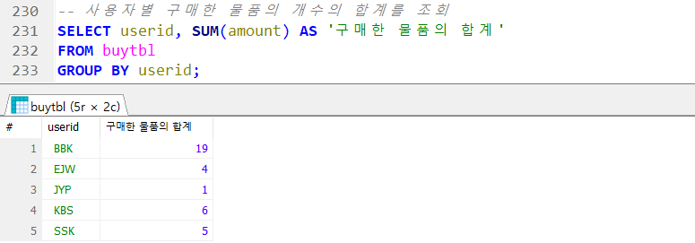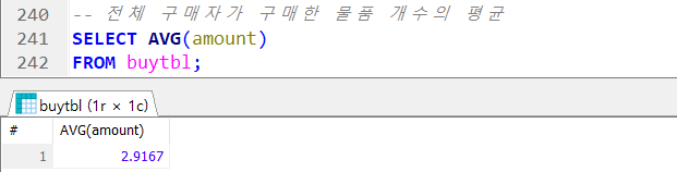 buytbl에서 평균 구매 개수를 조회