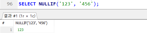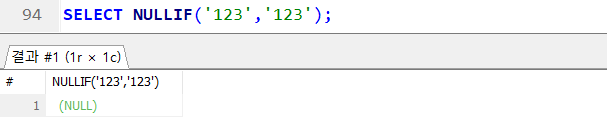 NULLIF(수식 1, 수식2) → 두 개의 값이 같으면 NULL 반환 !