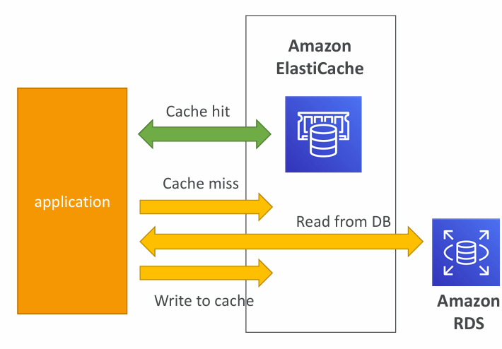 - 읽기 캐시 앞단: 앱 → ElastiCache(미스 시 DB 조회·채움)