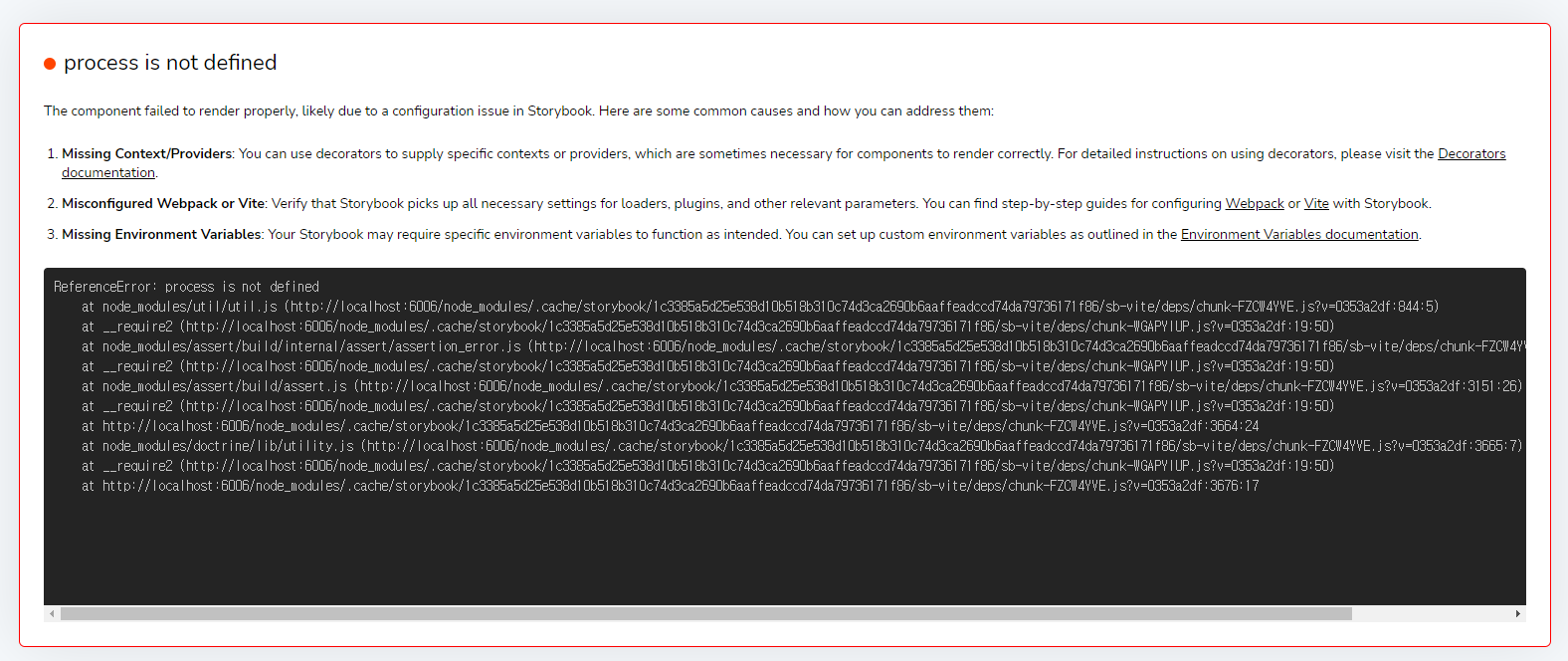 이 오류는 vite나 webpack을 사용하여 storybook을 구성하는 설정이 없을 때 발생한다는 의미였다. 난 vite 를 사용하고 있고, esbuild 를 사용하는 storybook이니만큼, 특정 설정을 빼먹었을 수도 있겠다..