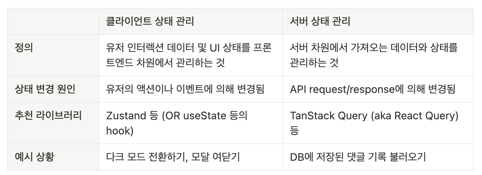 클라이언트 상태 관리는 주로 프론트엔드-유저 간의 상호작용 상황에서, 서버 상태 관리는 프론트엔드-백엔드의 상호작용 상황에서 전개된다.