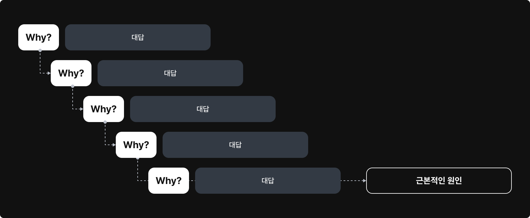 - 문제의 근본적인 원인을 파악하기 위해 5번의 질문을 반복해 보는 기법