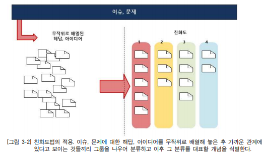 - 인터뷰, 포커스 그룹, 필드스터디 등의 정성적인 조사 결과를 분석하는 데 유용하게 사용 (여러 주제로 흩어진 자료를 정리해 일정한 그룹으로 정리하기 좋음)