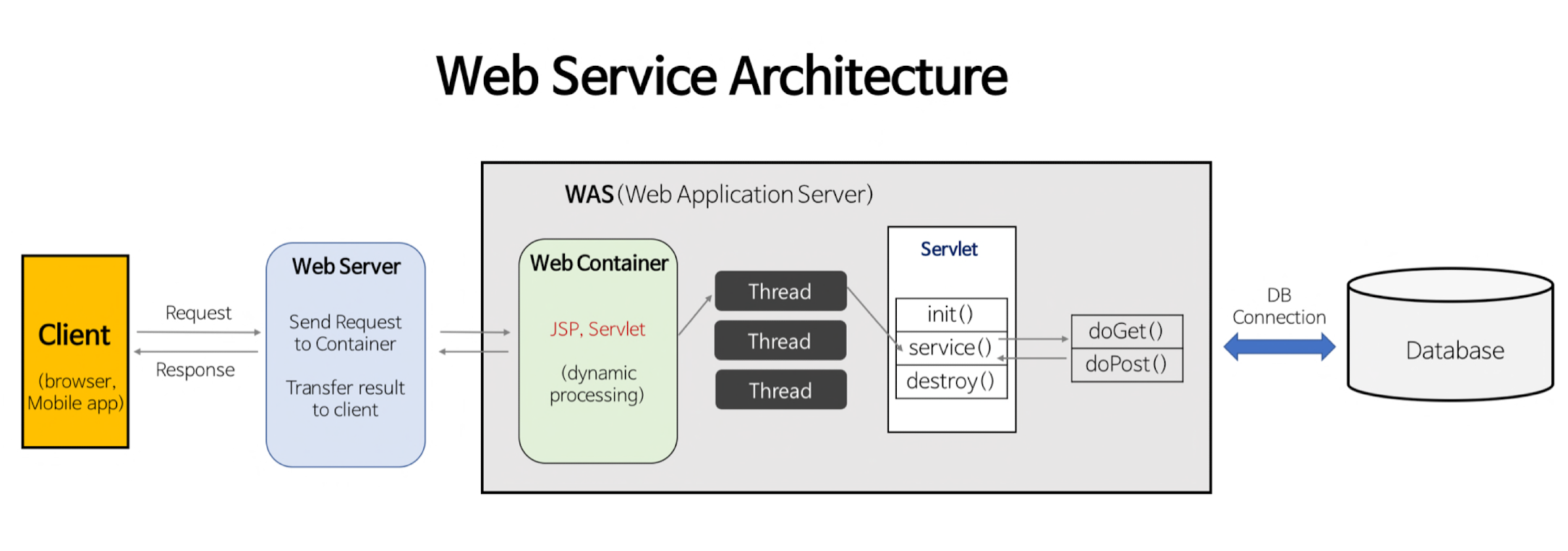 - WAS는 web.xml을 참조하여 해당 Servlet에 대한 Thread를 생성한다. (Thread Pool 이용)